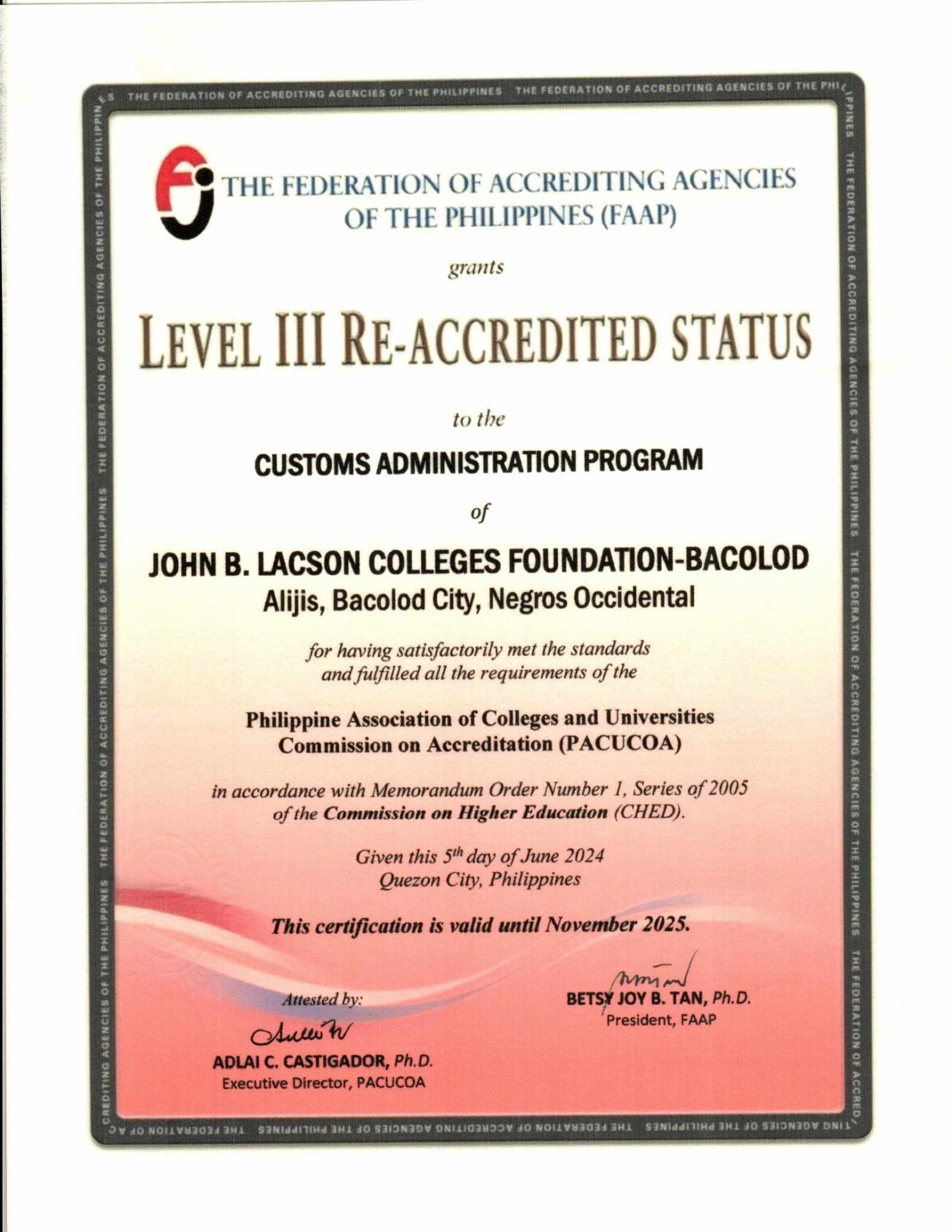 John B. Lacson Colleges Foundation is proud to announce the PACUCOA Level III Re-Accredited Status of the Bachelor of Science in Hospitality, Major in Cruise Ship Services, and Bachelor of Science in Customs Administration under the College of Business and Education.