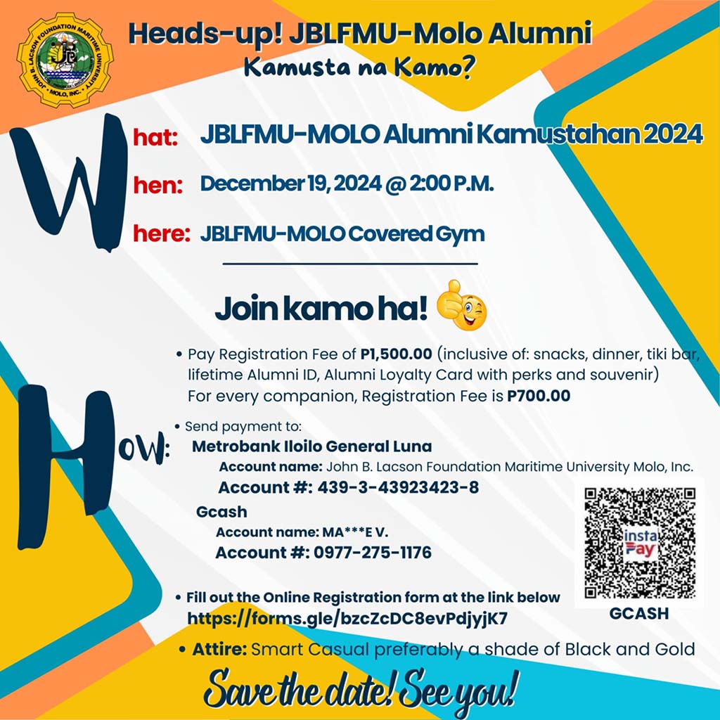We invite all John B - Molo alumni to our Alumni Kamustahan on December 19, 2024! It’s a great chance to catch up, reminisce about old times, and enjoy each other’s company. We can’t wait to see familiar faces and create new memories together!