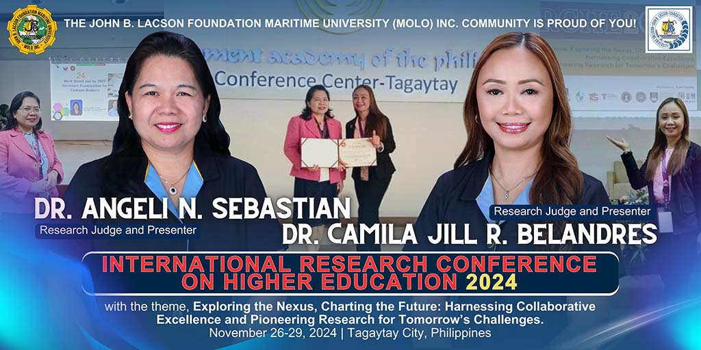Dr. Angeli N. Sebastian, Dean of the College of Business and Management, and Dr. Camila Jill R. Belandres, a Physical Education professor, presented research papers at the International Research Conference on Higher Education (IRCHE) 2024. This conference took place from November 26 to 29, 2024, at the Development Academy of the Philippines Conference Center in Tagaytay City, Philippines. The theme for this year's conference was βExploring the Nexus, Charting the Future: Harnessing Collaborative Excellence and Pioneering Research for Tomorrowβs Challengesβ