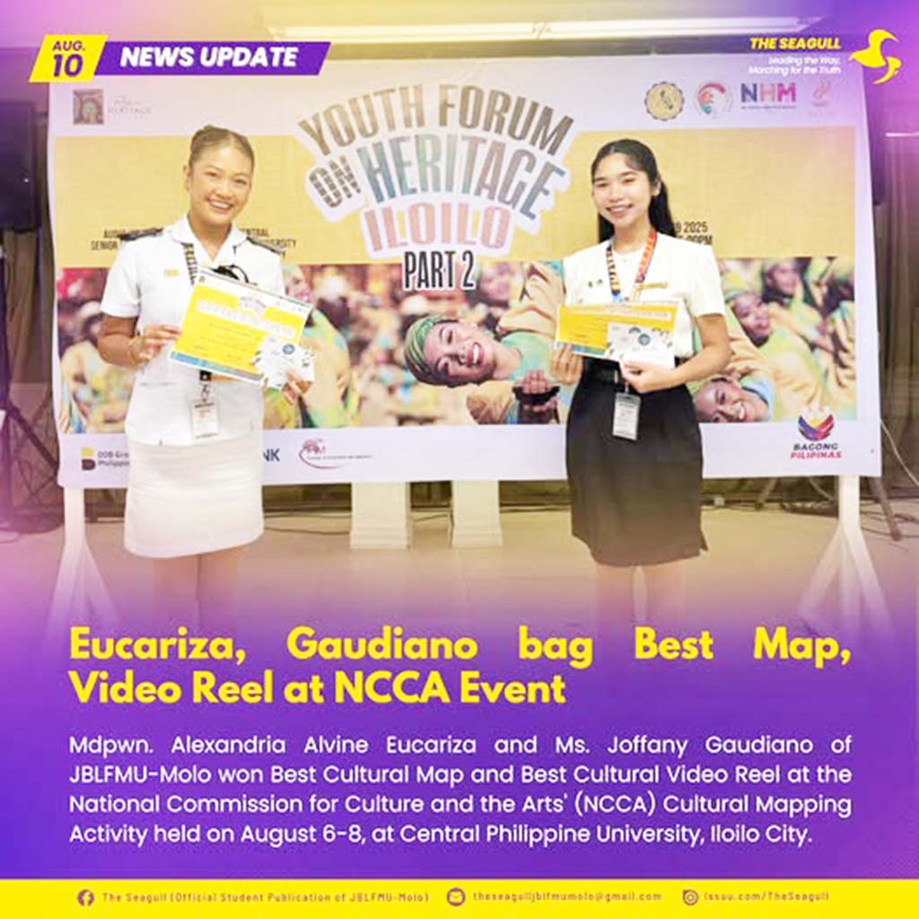 Mdpwn. Alexandria Alvine Eucariza (BSCSM-3) and Ms. Joffany Gaudiano (BSTM-3) of JBLFMU-Molo won Best Cultural Map and Best Cultural Video Reel at the National Commission for Culture and the Arts' (NCCA) Cultural Mapping Activity held on August 6-8, at Central Philippine University, Iloilo City.