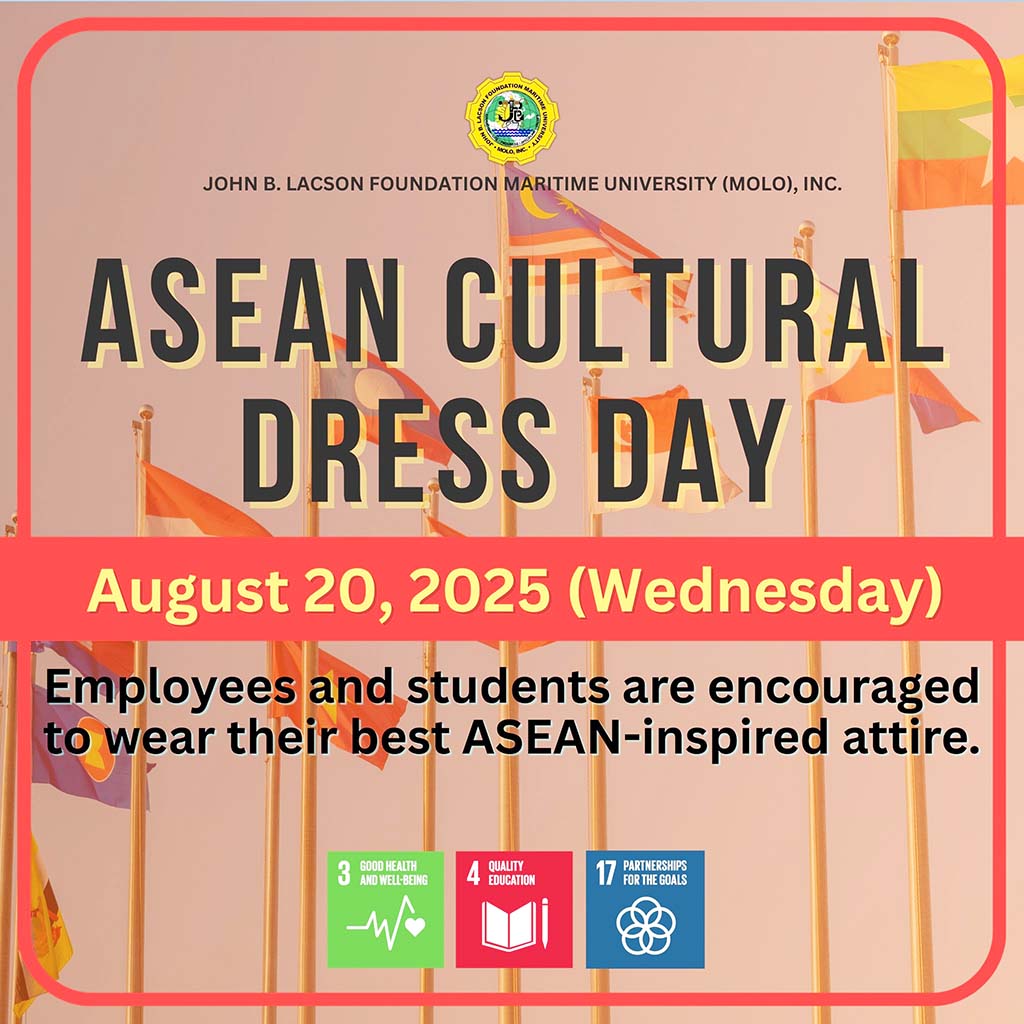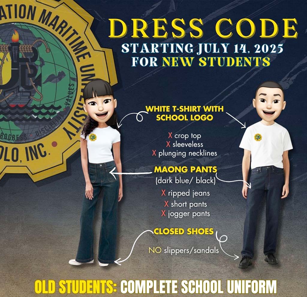 To all John B. Lacson Foundation Maritime University (Molo), Inc. students, the new school year officially begins on July 14, 2025! Do take note of the prescribed attire for your respective departments to ensure a smooth start: