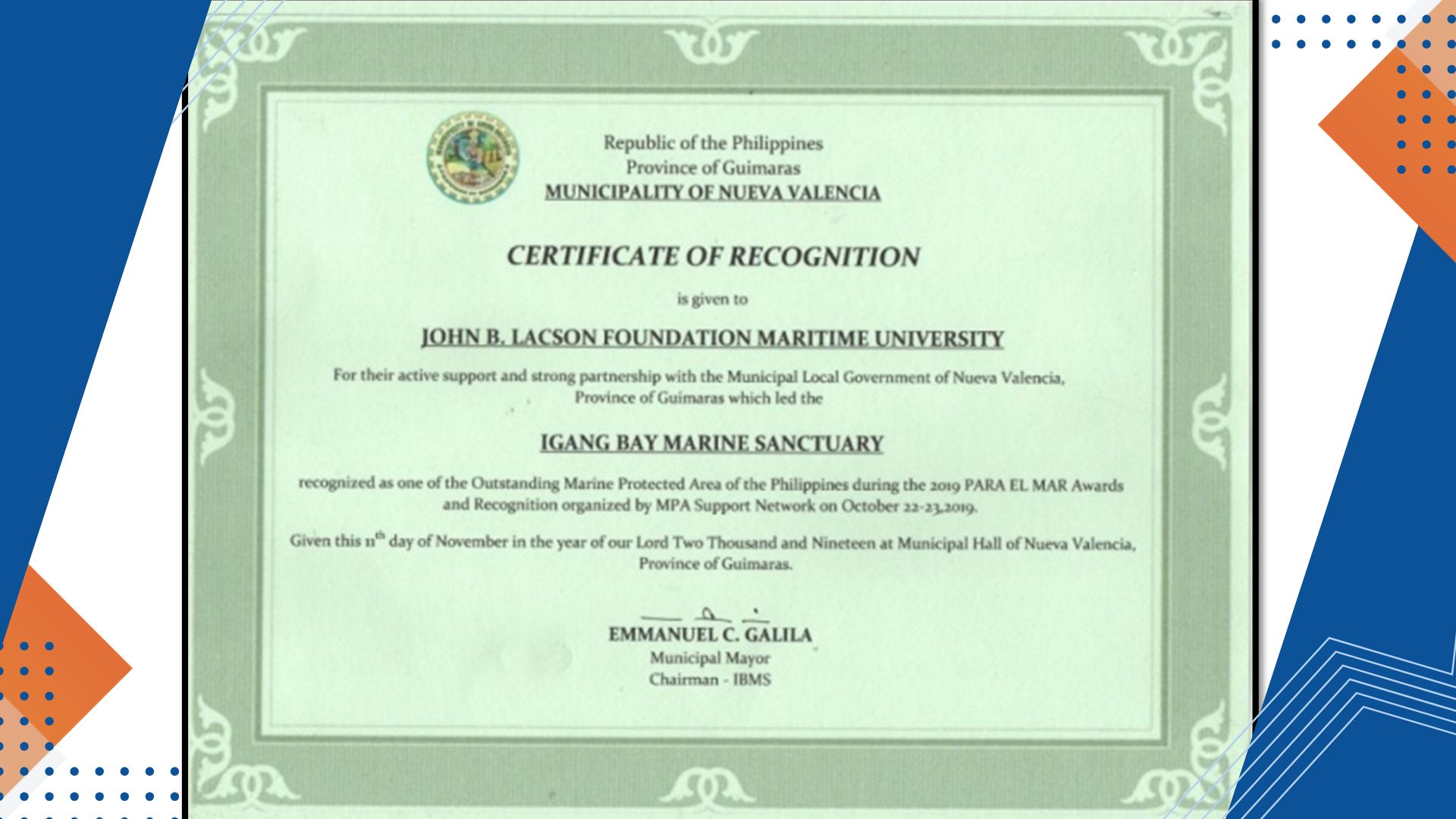 The Igang Bay Marine Sanctuary (IBMS), a public–private partnership between the John B. Lacson Foundation Maritime University (JBLFMU) and the Municipality of Nueva Valencia, was awarded Best Performi...
